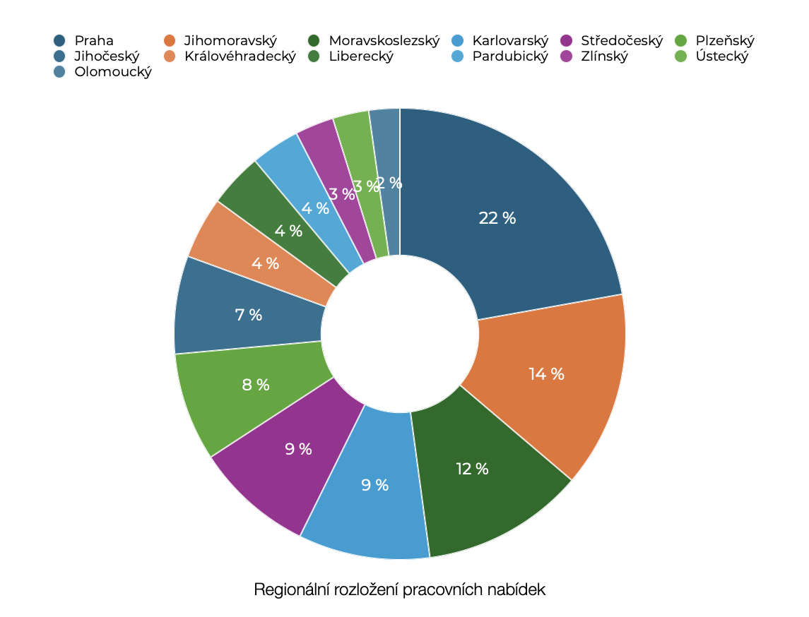 Nejvíce pracovních příležitostí je tradičně v Praze a Jihomoravském kraji, zatímco nejrychlejší růst nabídky práce zaznamenal Středočeský kraj.