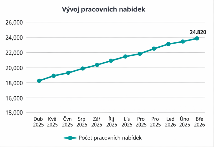 V březnu 2026 bylo v ČR celkem 24 820 pracovních nabídek. Počet nabídek postupně roste od dubna 2025, největší nárůst byl zaznamenán na začátku roku 2026.